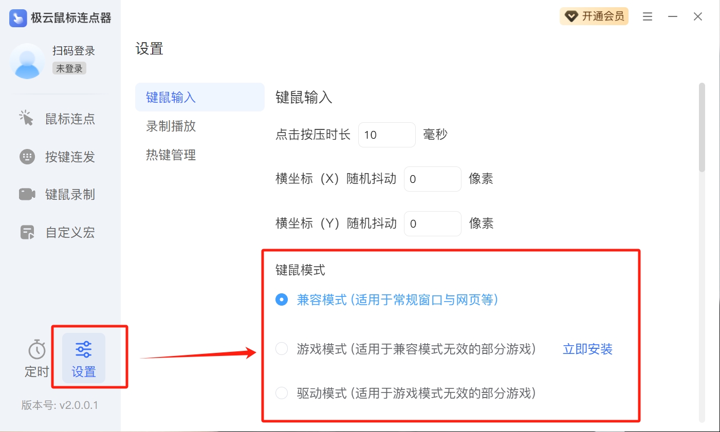 点击【设置】,在【键鼠输入】和【录制播放】模块均有不同的模式设置,需先安装插件,确认安装成功。