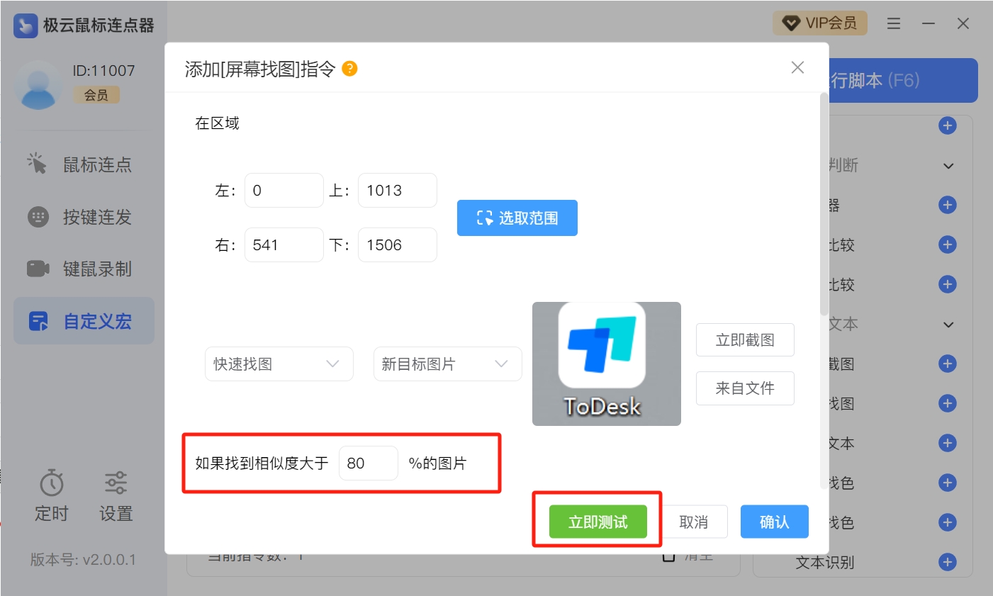 步骤五:设置相似度,设置越高,识别的准确性越高,但搜索速度则可能会降低;根据实际需求进行调整。设置好参数,可以点击【立即测试】。