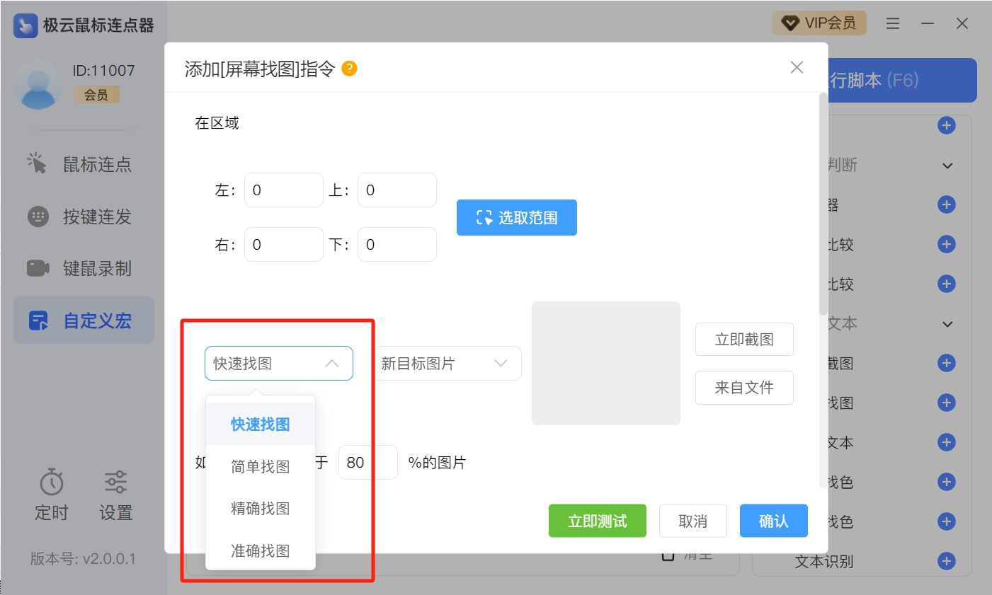 步骤三:设置找图模式,越精准则搜索越慢。(准确找图支持特征找图,即使图片变形也能找出)
