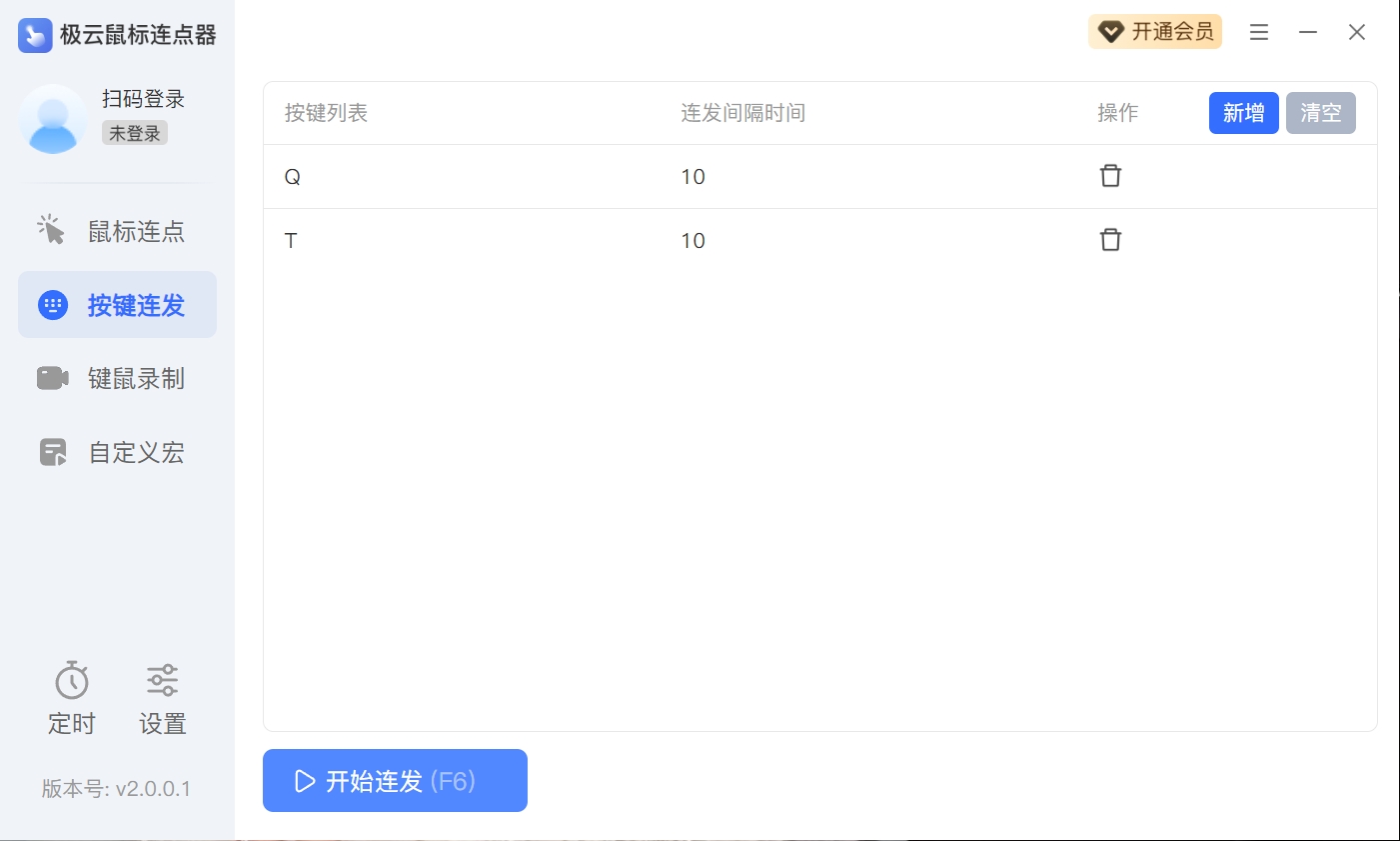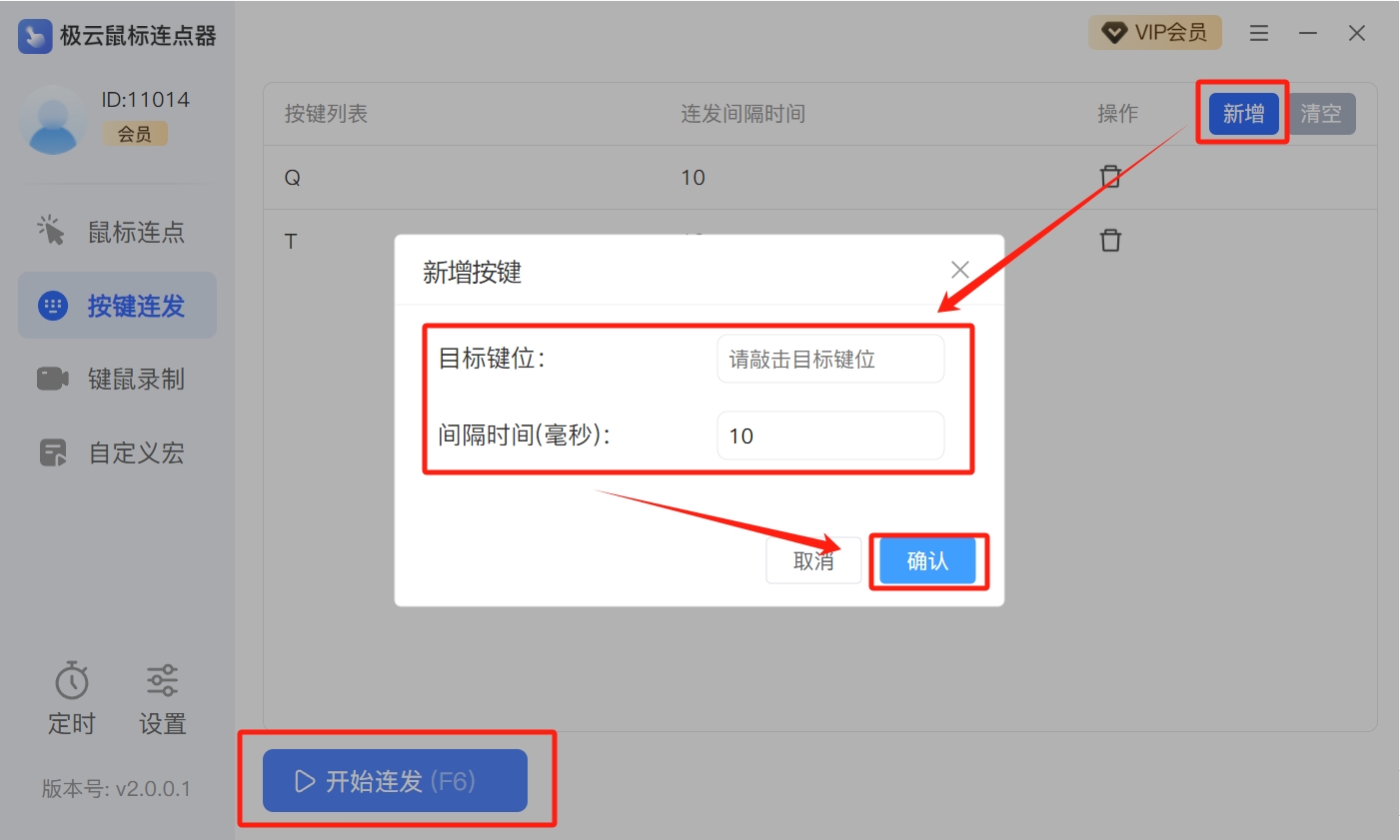步骤二:点击【开始连发】或按压【F6】键开始执行,长按【Q】键触发,软件会以设置的间隔时间持续按压。