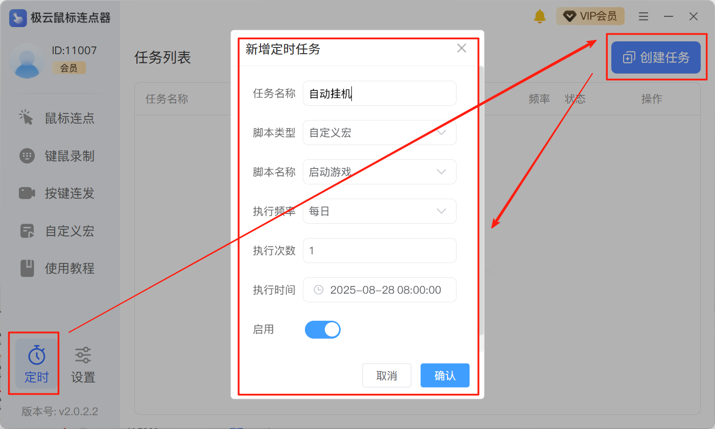 步骤十九:添加【定时】任务,例如:执行脚本A,执行频率每日,执行时间8点。则每天的8点自动打开游戏,进入副本刷怪,回城回收背包中的材料,以此循环五次后结束脚本。