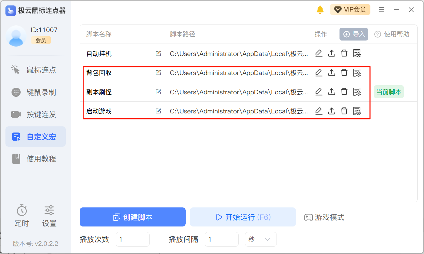 步骤十六:分别编写"启动游戏"脚本A、"副本刷怪"脚本B、"背包回收"脚本C等其他需要执行的脚本