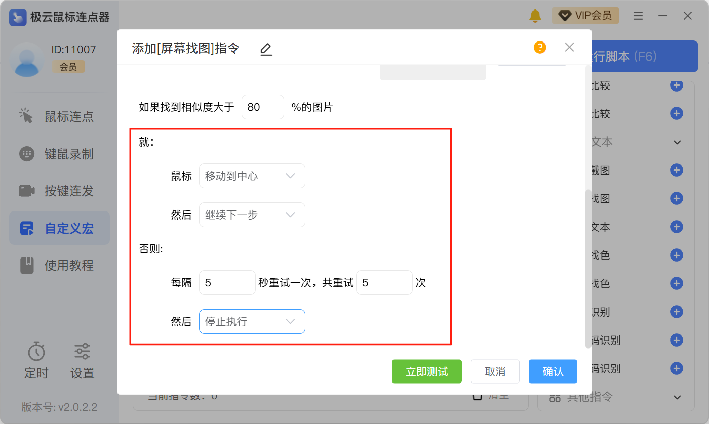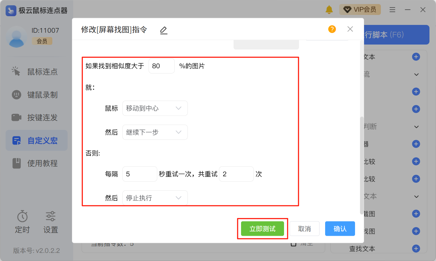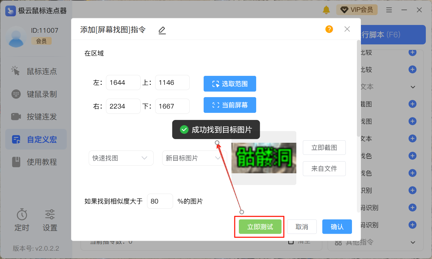 步骤六:点击【立即测试】,确认是否可以精准找到图,若未找到可以通过调整查找模式、相似度、以及选取范围解决