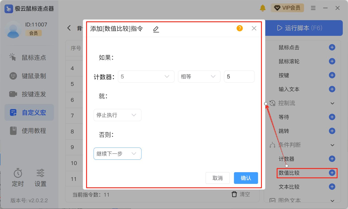 步骤十八:设置循环次数,在脚本C跳转指令前可以添加【计数器】和【数值比较】指令,例如【计数器】设置变量5,初始值0,每次执行加1;【数值比较】设置计数器5相等5就停止执行,否则继续下一步。每执行一次计数器就会加1,当计数器数值为5,在数值比较中对应的条件等于5则会结束该脚本。