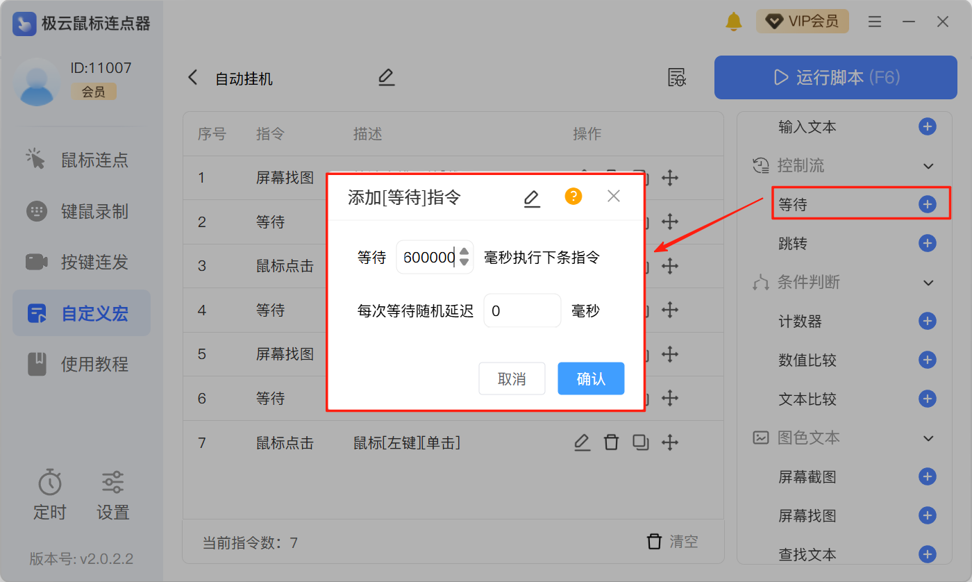 步骤十:添加【等待】指令,这里可以直接复制序号2的等待指令进去修改即可,人物需要走到点击位置,时间需要留长,这里的等待时间可以适当加长