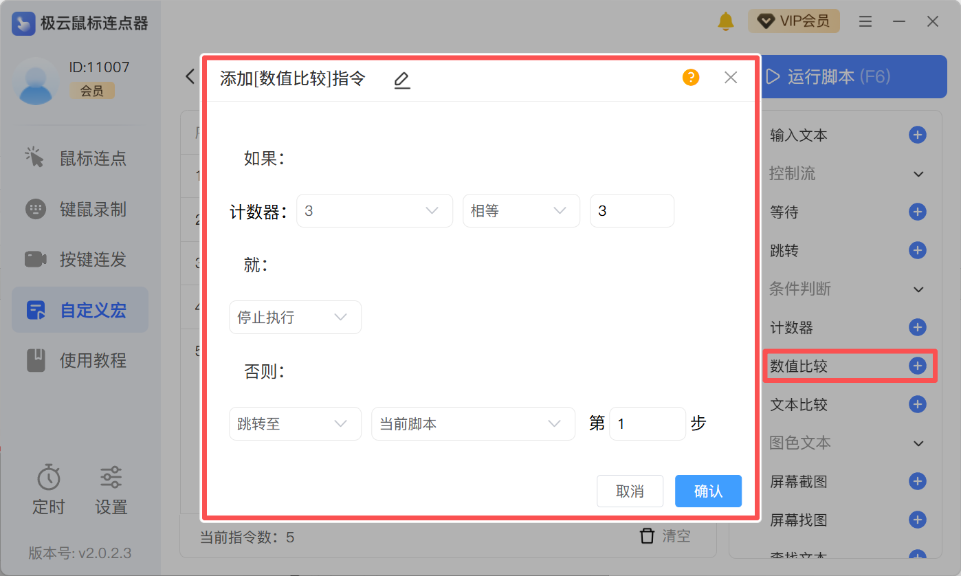 步骤二:添加【数值比较】指令,选择上一步【计数器】设定的变量,中间选择相等,右边的数值设为3,则会把计数器的变量与右侧数值3进行比较,如果不等于3就执行“否则:”后面的命令,等于3执行“就:”后面的指令。此处因为需要循环序号1-4,所以设置为跳转至当前脚本第1步,循环3次结束脚本。